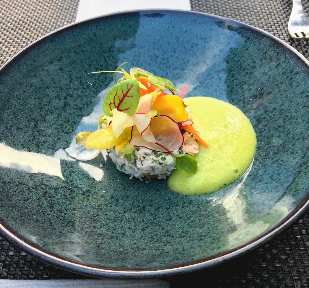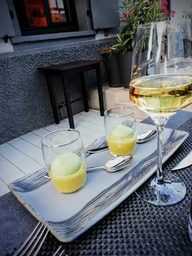 Nous avons débuté par un petit amuse-bouche à base de concombre et basilic, très frais pour un soir d’été.