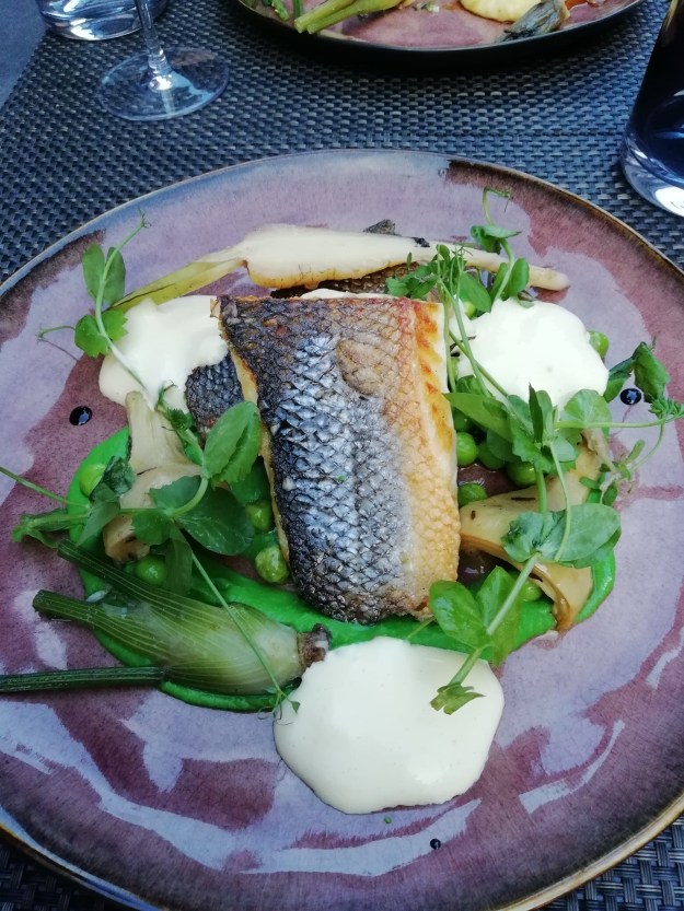 Le plat de poisson: Filet de bar à la plancha, le petit pois en texture, artichauts barigoule, oignons nouveaux et beurre mousseux au yuzu. Un plat riche en couleur, le poisson était cuit à merveille et son accompagnement matchait tout aussi bien.