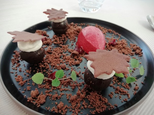 Nous voulons également vous partager un autre dessert qui était proposé à la carte : la revisite de la forêt noire. Sorbet à la griotte avec des éclats au cacao, des sphères au confit, mousse au chocolat… Bref, la présentation ainsi que la dégustation était à tomber !
