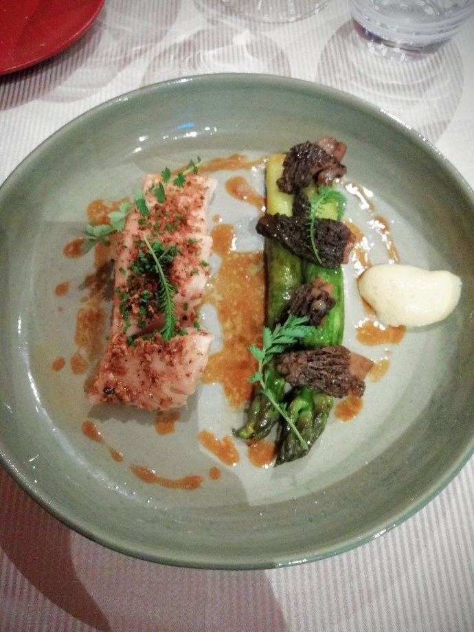 Suite à la dégustation de l’entrée chaude composée de truite, asperges et morilles, nous avons enchaîné avec le plat avec une langoustine rôtie, volaille et risotto crémeux. Le mariage terre et mer était très surprenant et s’associait à la perfection. Nous étions vraiment subjugués par la justesse des saveurs, le dressage et surtout la quantité ! Par contre, nous avons été déçus par les vins en accompagnement de nos plats n’ayant reçu aucun conseil et un service approximatif.