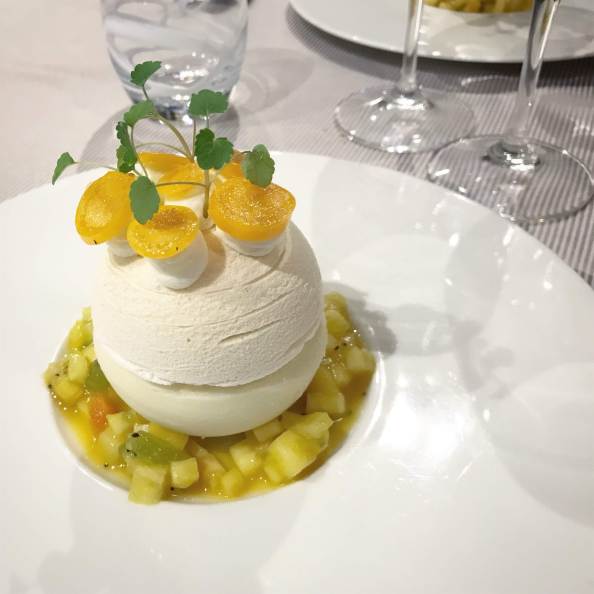 Le dessert quant à lui, a tenu toutes ses promesses ! Il nous fallait à ce moment du repas un dessert léger et frais et le vacherin contemporain aux fruits du moment répondait à toutes nos attentes. La présentation était originale pour un dessert qui se devait être un grand classique (vous pouvez en juger par vous même sur la photo ci-dessus). Cette revisite avec des fruits exotiques nous a fait voyager!