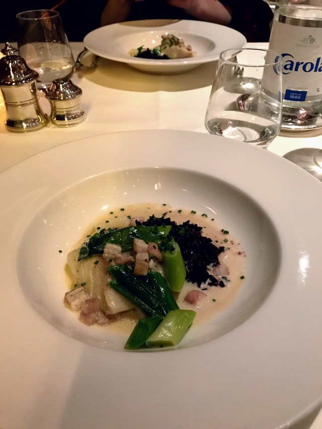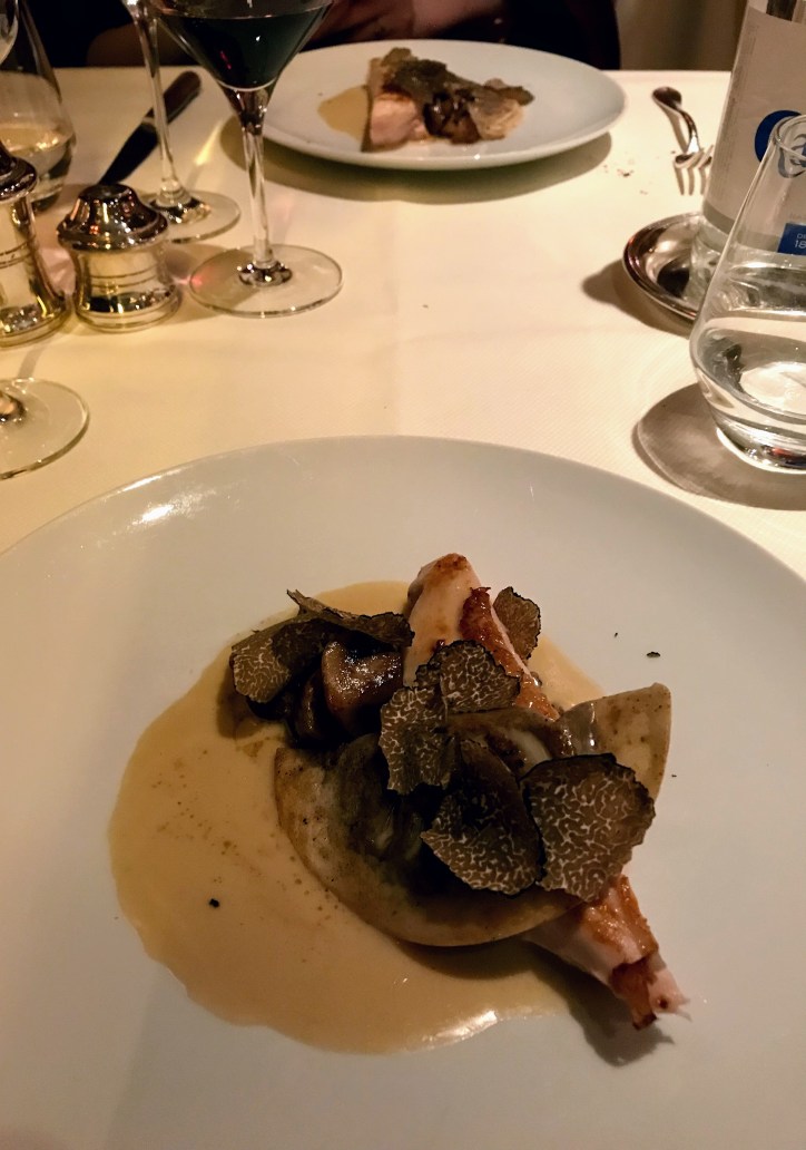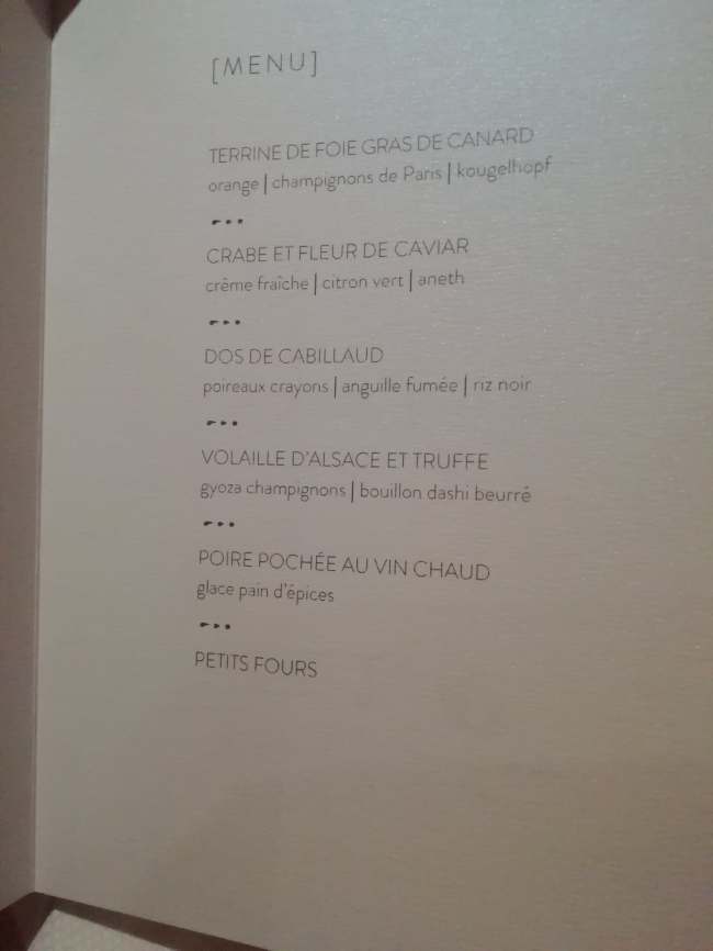 Les plats étaient d’une justesse parfaite entre le poisson, un cabillaud parfaitement cuit et une volaille d’Alsace avec truffe et gyoza de champignons. Les accords mets et vins étaient également à notre goût, mais un peu trop servi au vu du nombre de verres prévus dans la formule (heureusement nous n’avions pas loin pour rentrer 😉 ).