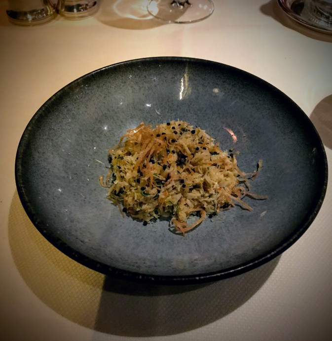 Pour la suite, nous avions une deuxième entrée plus fraîche et légère avec du crabe et caviar, citron et aneth. Il y avait toutes les textures, entre croquant et fondant accompagné d’un verre de Viognier.