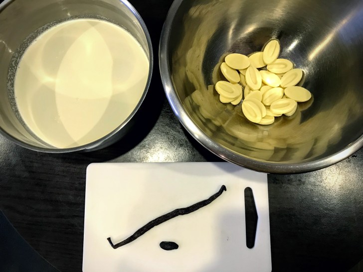 Faire bouillir la crème dans une casserole avec la gousse de vanille grattée et la fève tonka. Ensuite, placez le chocolat blanc en pastille ou en carreaux dans un saladier, puis versez la préparation en la passant au chinois.