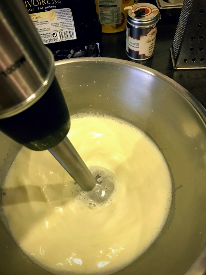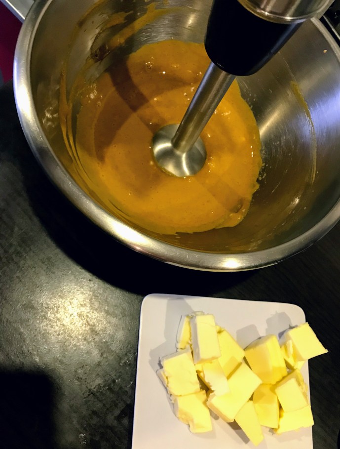 Laissez la température de la préparation redescendre à 40 degrés et y ajouter le beurre demi-sel en plusieurs fois à l’aide d’un mixeur plongeant.