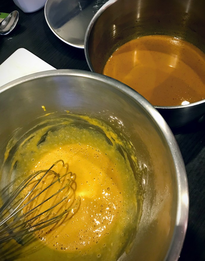 Versez la préparation lait-caramel chaude sur le mélange précédent. Reversez le dans la casserole et portez à ébullition pendant 2 minutes sans cesser de mélanger jusqu’à obtention d’une texture de crème pâtissière.