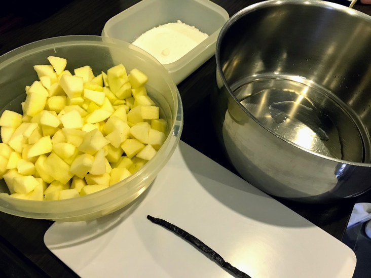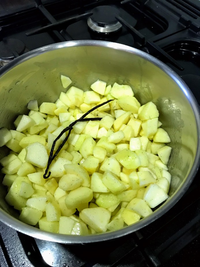 Ajoutez les pommes puis faites cuire à l’étouffé pendant 20 minutes. Ôtez la vanille et mixez le tout au mixeur plongeant.