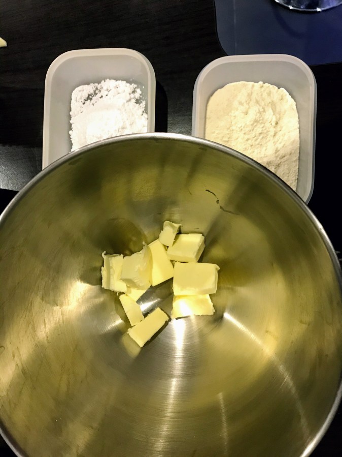 Placez le beurre au batteur muni d’une feuille, puis ajoutez le mélange sucre glace – farine tamisé. Placez la pâte dans le moule de 25 cm (mettre une feuille de papier sulfurisé au fond).