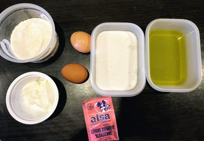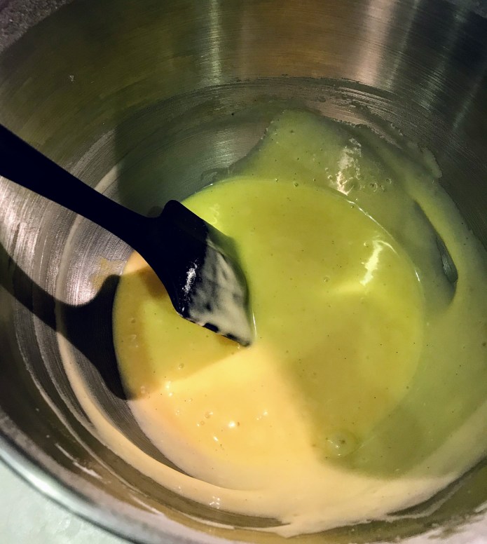 Baissez la température du four à 170°. Faites blanchir les œufs avec le sucre vanillé (ou le sucre semoule avec les graines de gousse de vanille) dans un batteur muni d’un fouet. Ajoutez la crème épaisse. Tamisez la farine avec la levure chimique et ajoutez-les au mélange précédent, incorporez l’huile d’olive.