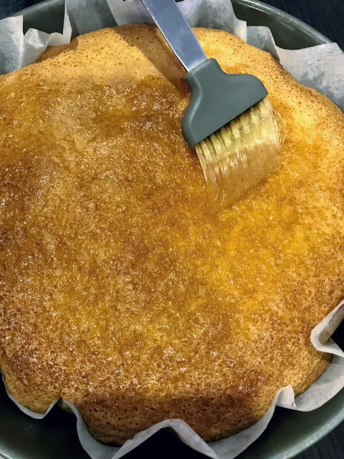 Mettre l’eau, la gousse de vanille et le sucre dans une casserole, portez à ébullition. Dès la sortie du four, imbibez le biscuit tiède à l’aide d’un pinceau.