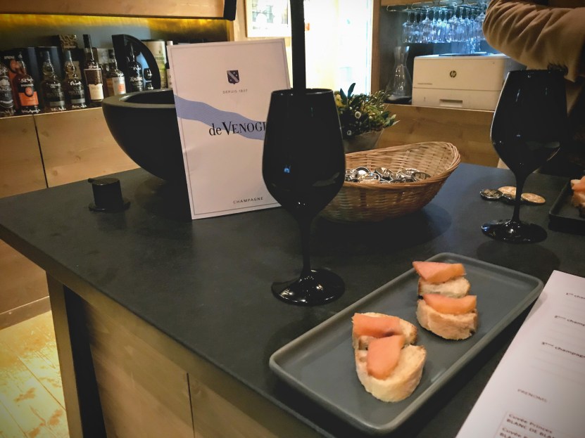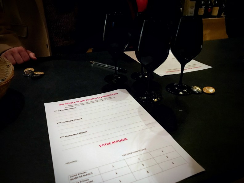 Le caviste nous a proposé de tester nos sens en participant à la dégustation commentée et ludique de trois vins de Champagne à découvrir à l’aveugle dans des verres noirs. Nous devions reconnaître les trois cuvées « Princes » de la Maison de Champagne De Venoge à Épernay : un Champagne Blanc de blancs, un Champagne Blanc de noirs et un Champagne rosé.