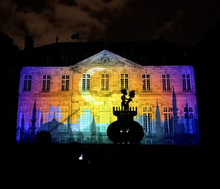 Alliant animation traditionnelle et nouvelles technologies, le studio « Animaillons ! » et l’association « Art Puissance Art » ont présenté un vidéo-mapping inspiré des récits d’amour courtois. Papier découpé et dessin animé à la main, vidéo, poésie et musique se sont assemblés le temps d’un spectacle son et lumière, donnant la parole aux murs du Palais Rohan pour une vibrante déclaration à tous les amoureux…