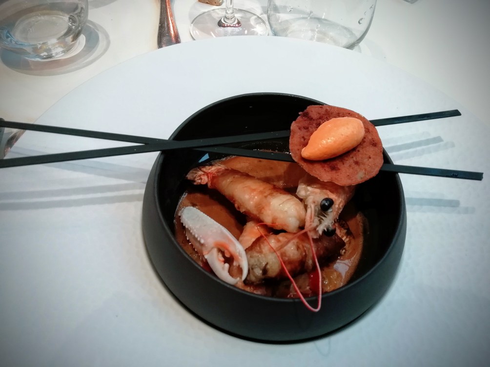 Nous avons choisi le plat de poisson composé de queues de Langoustines croustillantes, accompagnées d’un chutney d’ananas et de poivrons rouges, de fumet de carcasses et fines lamelles d’encornets. Encore une fois, rien à redire sur la cuisson et les saveurs exotiques avec l’ananas qui vient sublimer ce plat subtilement ! Le dressage de cette assiette était la plus intéressante de tout notre repas, notamment avec les baguettes et le bol noir.