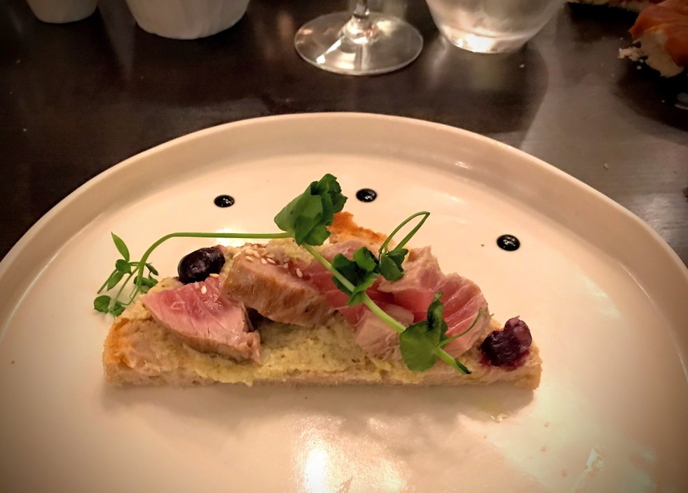 Pour démarrer ce repas autour du raisin, nous avons tous les deux opté pour la même entrée qui était composée d’une tartine de thon mariné au Melfort (vinaigre alsacien) et raisins moelleux. L’assiette était dressée minutieusement et très bien assaisonnée.