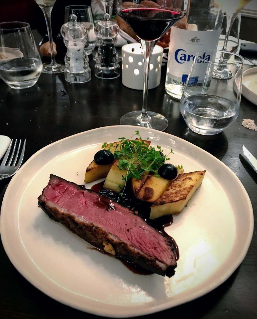 Nous avons enchaîné notre dîner avec de la viande pour l’amoureux et du poisson pour l’amoureuse 😉 La tradition est toujours présente dans le plat avec un magret de canard accompagné de Griesknepfle (bâtonnets de semoule) et une sauce aux raisins « de nos vendanges ». Les souvenirs d’enfance sont remontés avec les Griesknepfle cuisinés comme ma grand-mère avec la sauce aux raisins qui ajoute cette note sucrée au plat, un délice !
