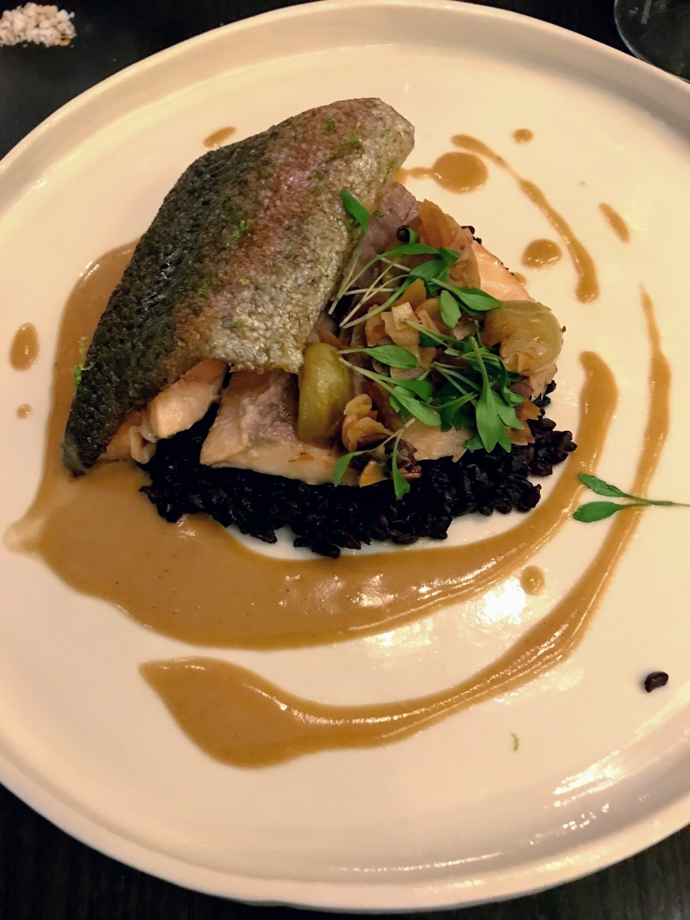 La truite aux amandes était très tendre, accompagnée de raisins secs et riz noir qui a littéralement séduit l’amoureuse.
