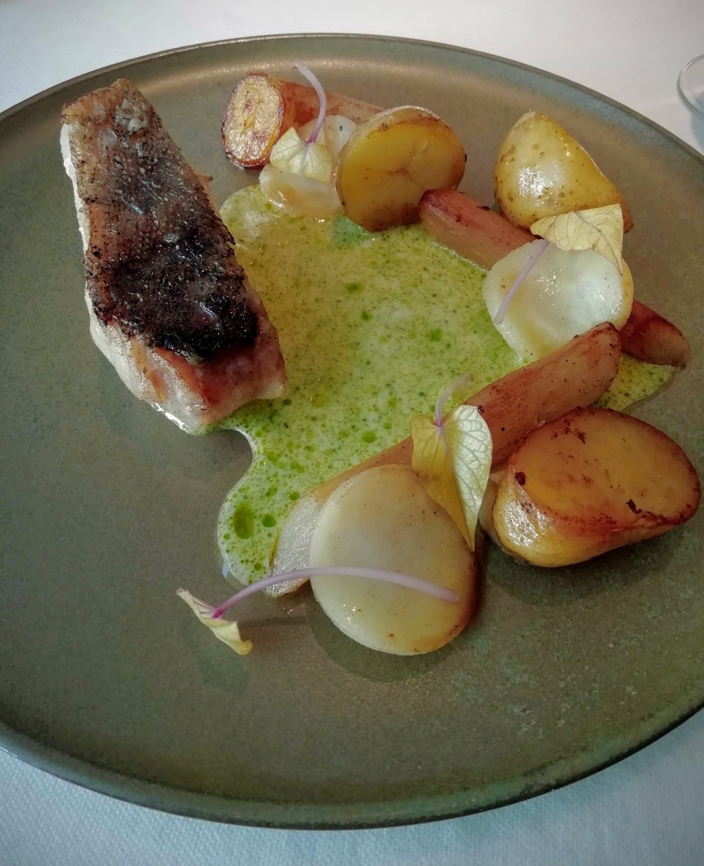 Le menu « au rythme des saisons » en 3 services (entrée – plat – dessert) nous a conquis pour le prix de 39€. Pour éveiller nos papilles en douceur une première bouchée végétale suivie de l’entrée composée d’un bloc de foie gras traditionnel accompagné de légumes de saison pour apporter du peps au plat. C’est en soi une entrée plutôt classique et proposé dans tous les restaurants mais le dressage minutieux et les accords nous ont plu.