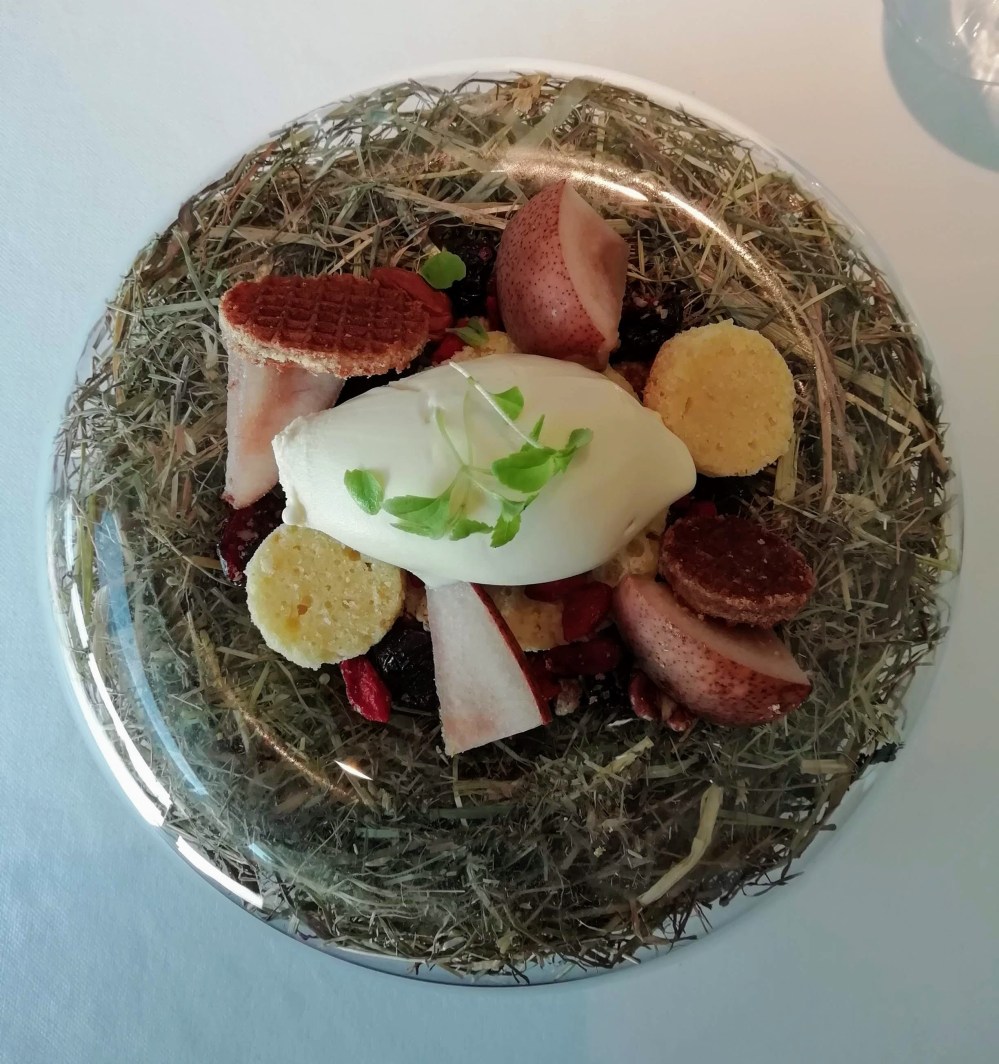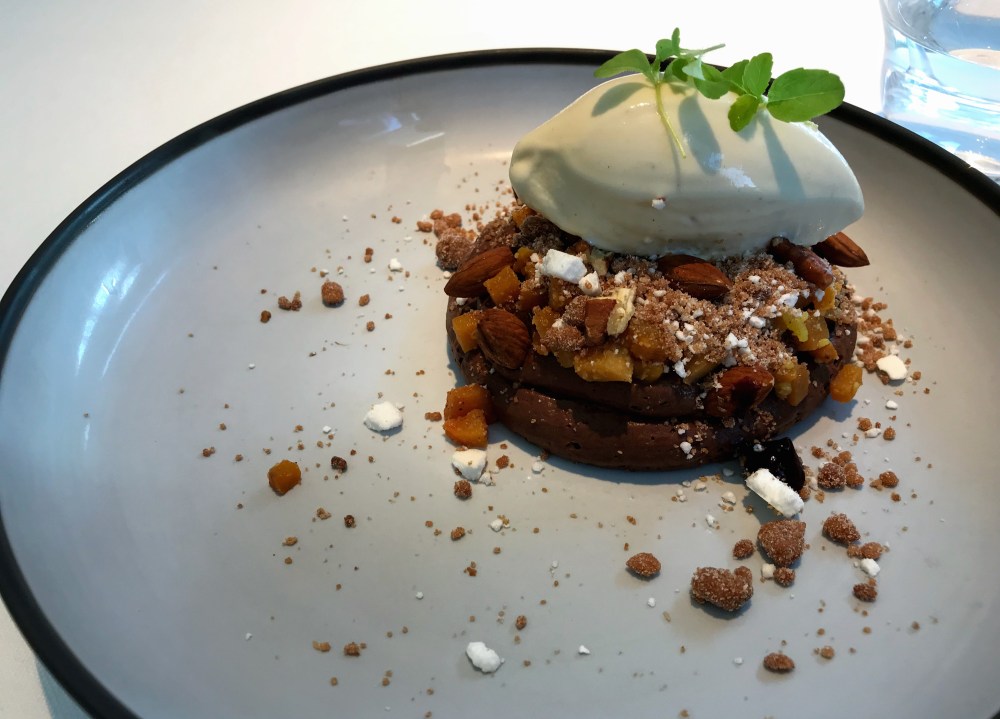 Pour en découvrir davantage, les deux desserts on été dégustés par nos palais. Nous avions tout d’abord été attiré par la glace au topinambour, foin, poires mêlées à un biscuit, du miel et des fruits secs. Nous avons été vraiment très étonné par cette proposition et le dressage qui en jette !