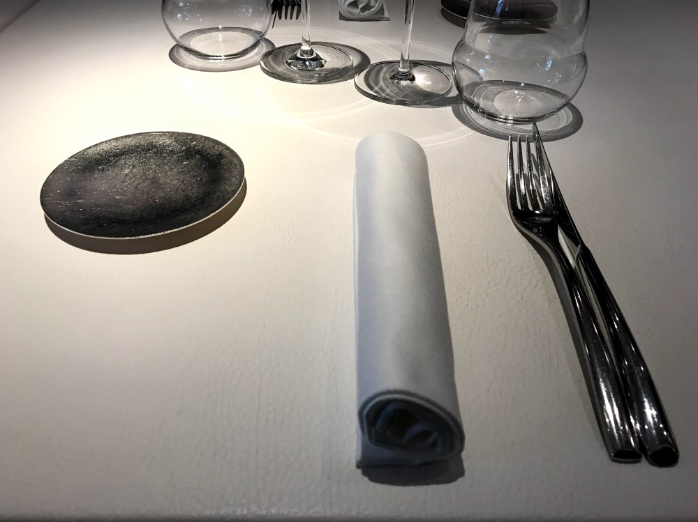 Dès les premiers instants, nous avons été bluffé par le changement de décoration ! Moins de tables, une décoration plus épurée, qui donne une ambiance beaucoup plus contemporaine. Le vert un peu flashy a été remplacé par des couleurs plus sobres et des matériaux nobles (bois, velours, …). Nous avons également découvert qu’il y avait une table du chef ! Si vous cherchez à impressionner quelqu’un, il vous faut absolument réserver cette table qui se trouve dans la cuisine ! Cela vous permettra d’avoir un repas en toute intimité et d’échanger directement avec le chef, rien de mieux pour un dîner en tête à tête.