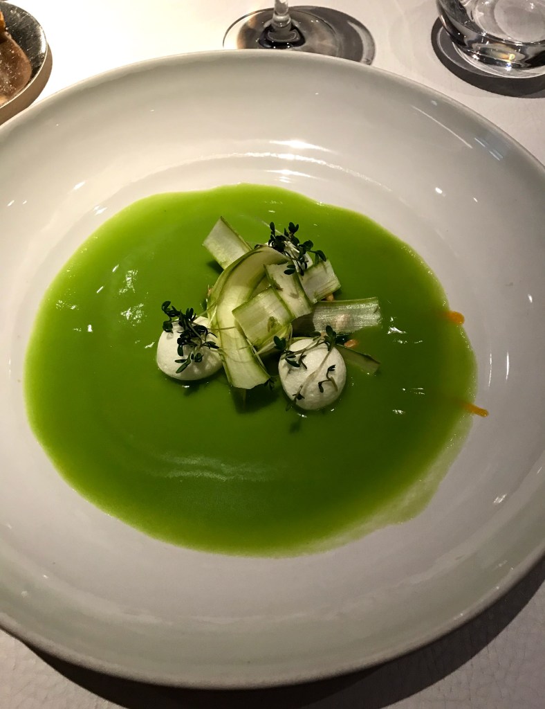 Mais ce n’est pas tout, un gaspacho d’asperge verte a été versé autour de cette préparation, que du plaisir pour nos papilles et pupilles ;-).