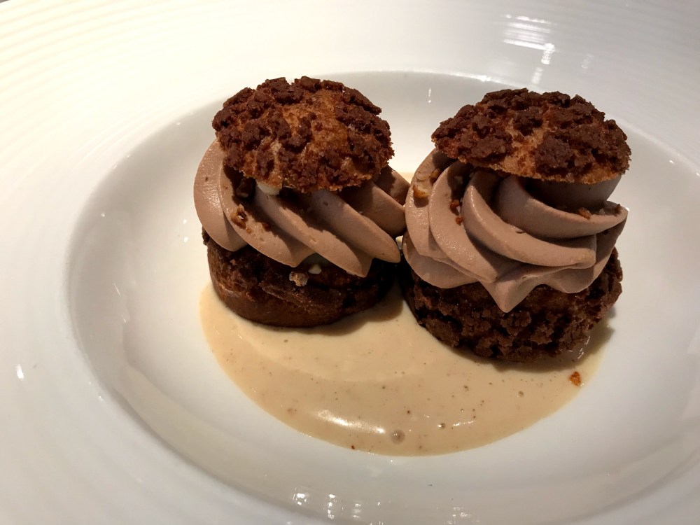 Le meilleur pour la fin, ce n’était pas facile de choisir entre un dessert fruité ou plutôt chocolaté ! Le chou croquant avec le craquelin au chocolat était composé d’une compote à la banane avec une chantilly au chocolat au lait. C’était un dessert gourmand et régressif grâce à ces deux choux posés simplement sur une sauce à la cacahuète. L’assiette a été vidée en quelques secondes, un délice !