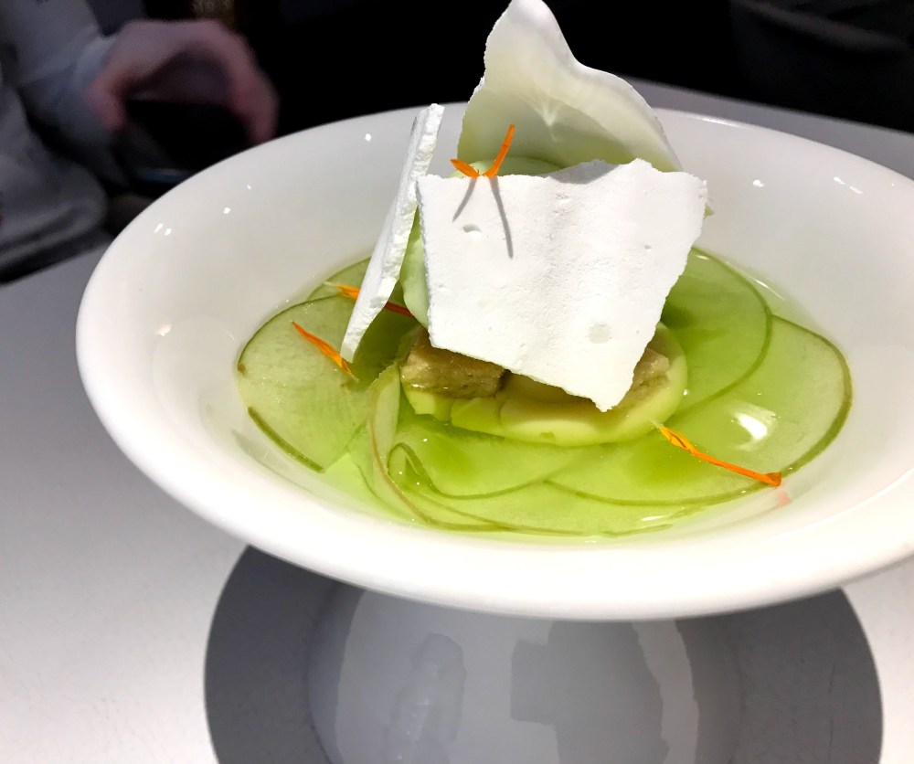Le second dessert aux pommes marinées accompagné d’une crème de citron et relevé au jus de chartreuse verte. Très léger, avec des meringues, un sorbet à la pomme et d’un biscuit moelleux ! Bref, c’était un joli dessert, bien construit et frais !