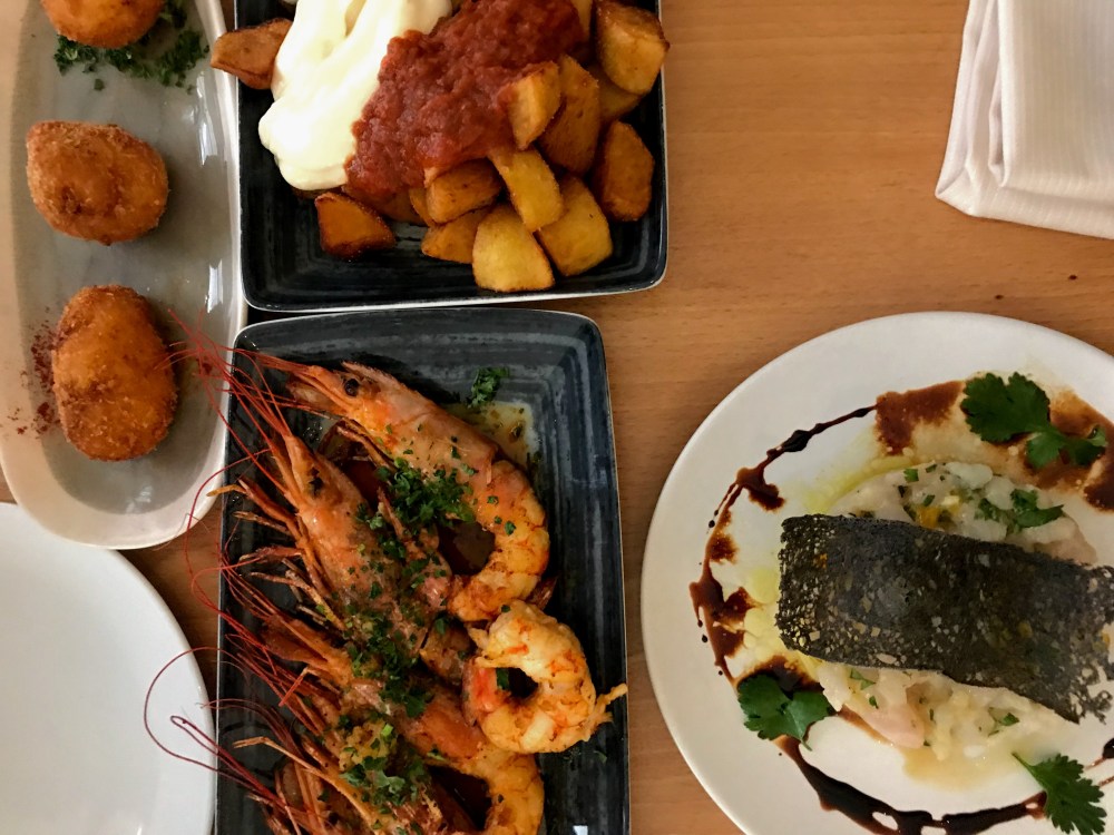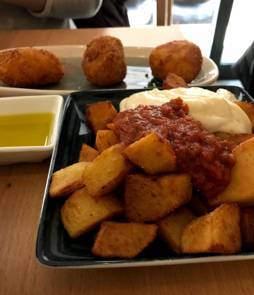 Pour démarrer nous avions du pain avec de l’huile d’olive sur la table, ce qui nous a permis de patienter jusqu’à l’arrivée de nos premiers tapas. Nous avons sélectionné les indémodables croquetas (au jambon, au chorizo et celle du chef). Pour accompagner cela, nous avions des patatas bravas, également un plat incontournable des tapas avec une sauce épicée et de l’aïoli.