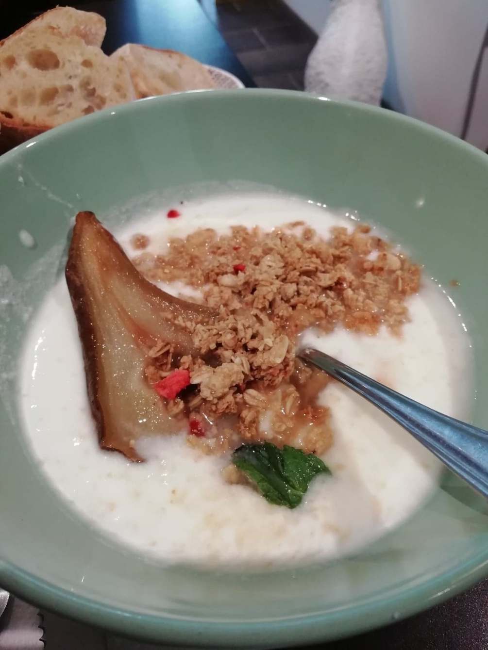 L’amoureuse quant à elle, a été plus raisonnable, avec un yaourt maison accompagné d’une poire caramélisée (pour les 5 fruits et légumes par jour ^^), des pépites de granola pour le côté croquant, de la cannelle pour rajouter du gourmand et de la menthe pour la fraîcheur. Autant vous dire que ce dessert était une vraie claque ! Le yaourt était irrésistible, d’une douceur indescriptible et probablement le meilleur yaourt au fromage jamais dégusté.