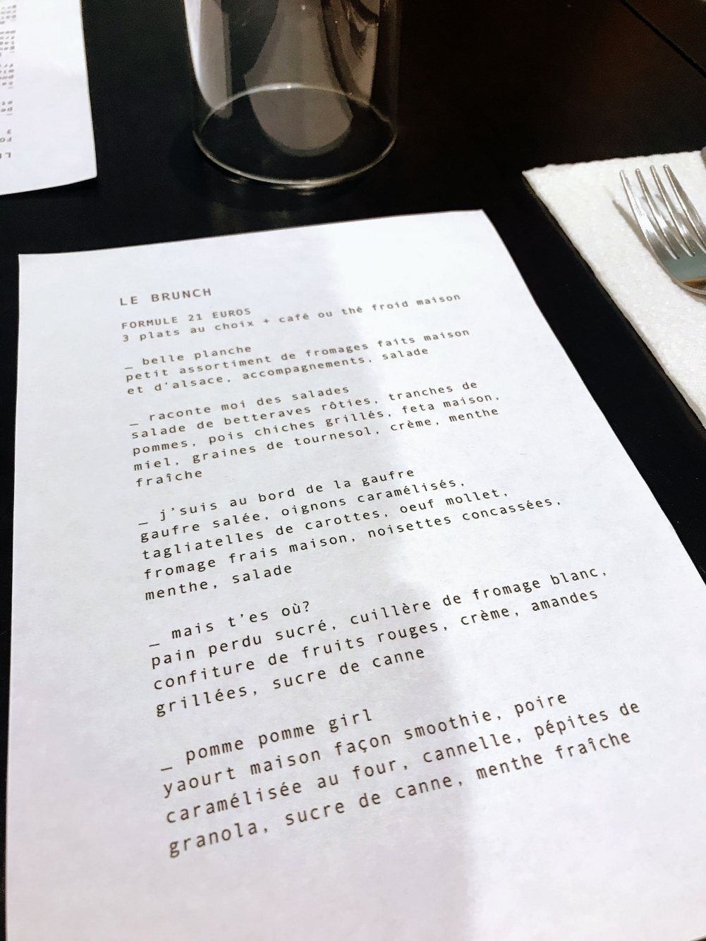 Le concept de brunch chez pour de bon est assez simple. Pour 21 euros par personne vous avez à la carte, 5 propositions d’assiettes (3 salées et 2 sucrées) où il vous faudra en choisir 3, le tout accompagné de café ou de thé froid. Le choix n’était pas évident à faire, parce que tout nous a donné littéralement envie ! Voici les plats pour lesquels nous avons craqué :