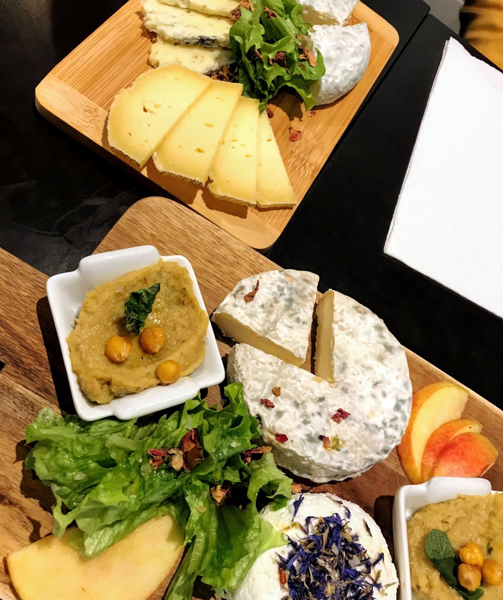 Cette planchette de fromages a fait l’unanimité ! Nous étions 3 à jeter notre dévolu sur la dégustation des fromages. Il nous paraissait évident, de déguster ces produits faits maison et découvrir les fromages réalisés par la cheffe. Nous avions le plaisir de découvrir un fromage frais de vache aux bleuets, un gringalet, un fromage de vache encore sans nom, une tomme ainsi qu’un fromage travaillé comme un morbier. Deux de ces fromages provenaient d’une ferme à Dorlisheim, le reste directement réalisé dans la partie laiterie au sein de ce petit cocon. Certains étaient crémeux à souhait, comme le fromage frais aux bleuets, idéal à tartiner ! Le tout était accompagné de houmous maison et de tranches de pommes. MIAM !