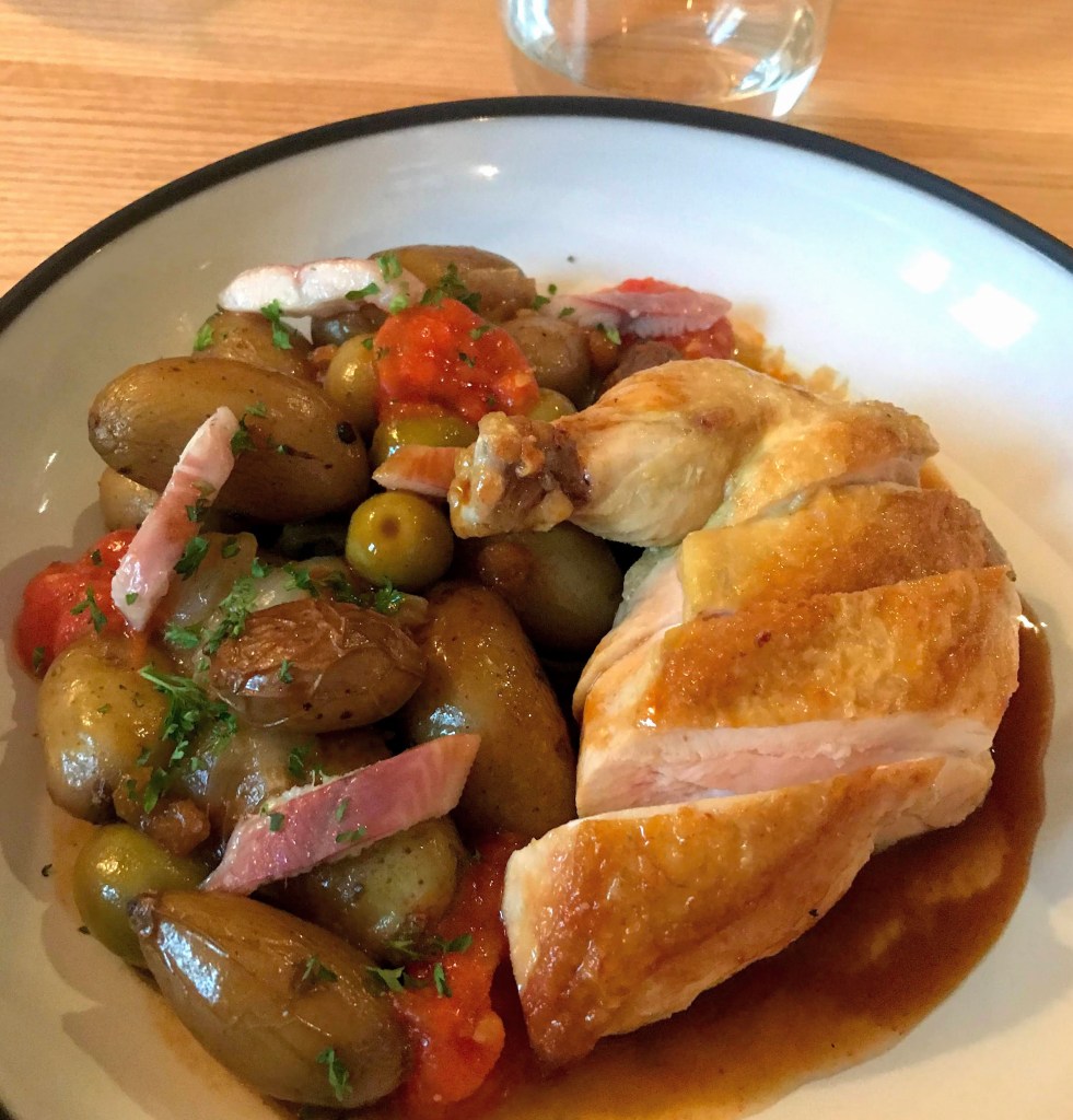 Nous avons salivé devant ce plat généreux. Nous avions qu’une hâte de déguster cette viande avec cette peau croustillante à souhait. Les pommes de terres cuites avaient un goût comme le faisaient nos grands-mères. Une touche terre et mer avec de l’anguille fumée et le peps des tomates et citrons caramélisés pour relever le tout, sans oublier les olives. Nous avons rendu nos assiettes propres, avec plein de bonheur et d’étoiles dans les yeux.