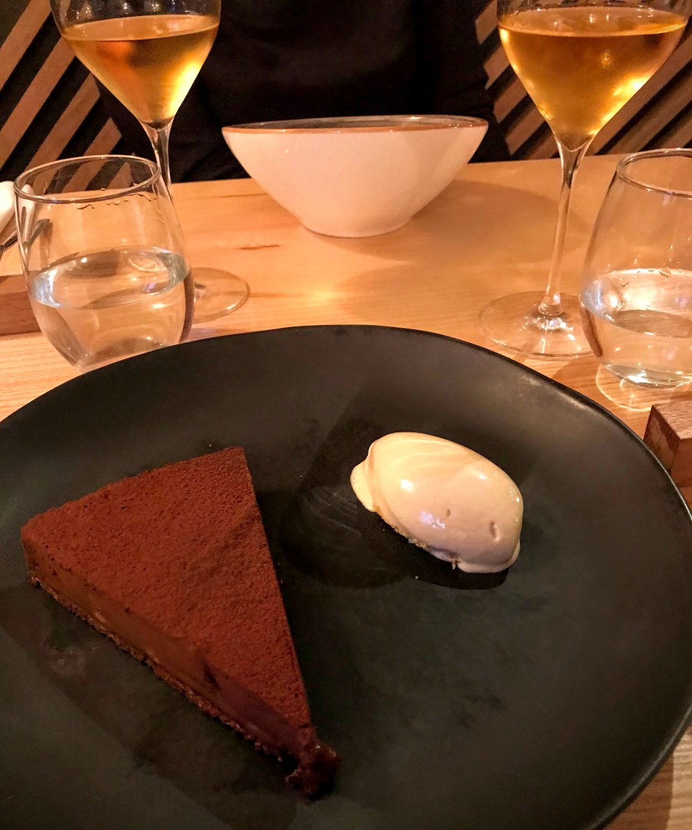 La tarte au chocolat a été choisie par le plus gourmand de nous deux. Cette tarte avait un caramel au beurre salé juste en dessous de la ganache au chocolat intense, une pâte sucrée cacao/cacahuètes croustillante et pour la touche de fraîcheur une glace au café. Rien à dire, l’amoureux a presque atteint le Nirvana avec toutes les textures et saveurs ultras gourmandes, comme il aime.