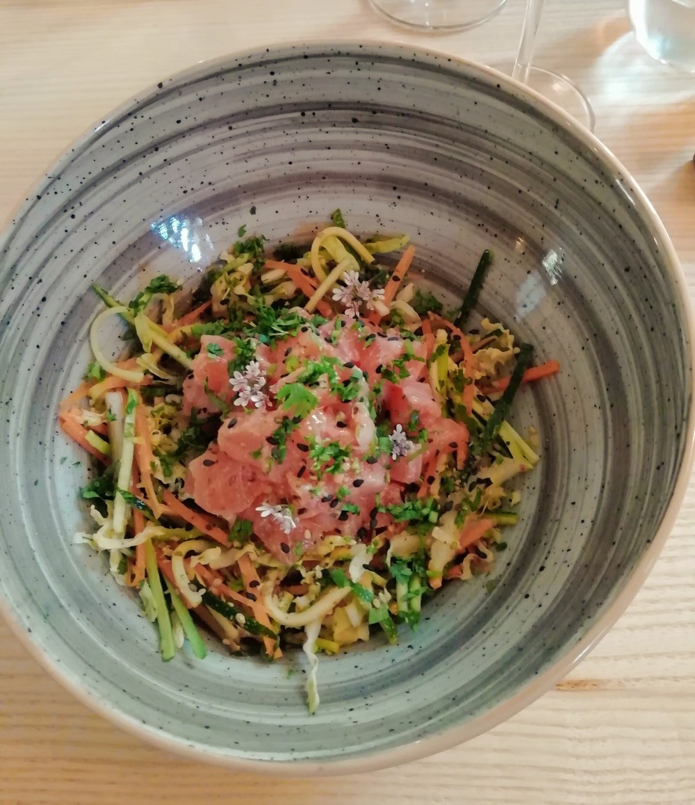 Le Tartare de truite d’Alsace entouré de légumes croquants avec une pointe de sésame et de coriandre. Pour assaisonner le tout, une sauce thaï qui nous a fait voyager en Asie depuis Schiltigheim. Notre avis a été sans appel, une entrée gourmande avec la fraîcheur de la truite et l’équilibre des saveurs entre les épices et les légumes, un délice !